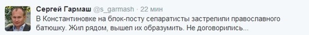 У Костянтинівці на блокпосту застрелили православного священика. Про це у своєму Twitter повідомив головред донецького видання ОстроВ Сергій Гармаш.